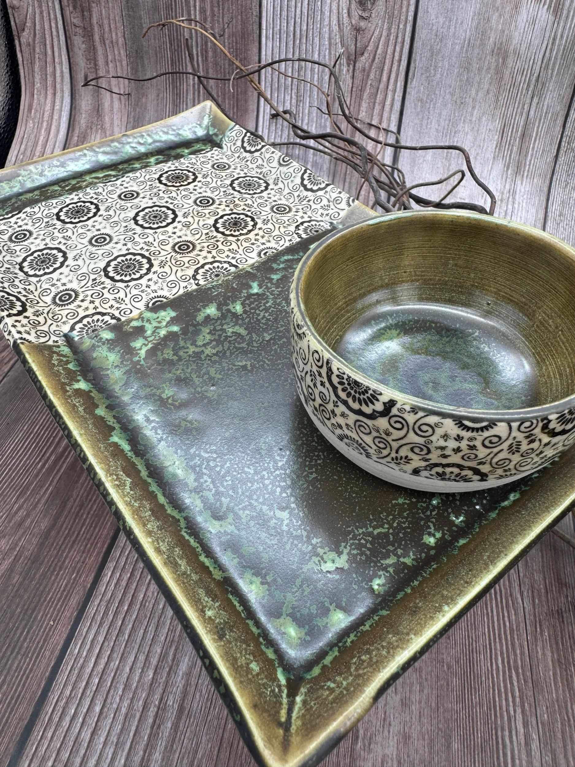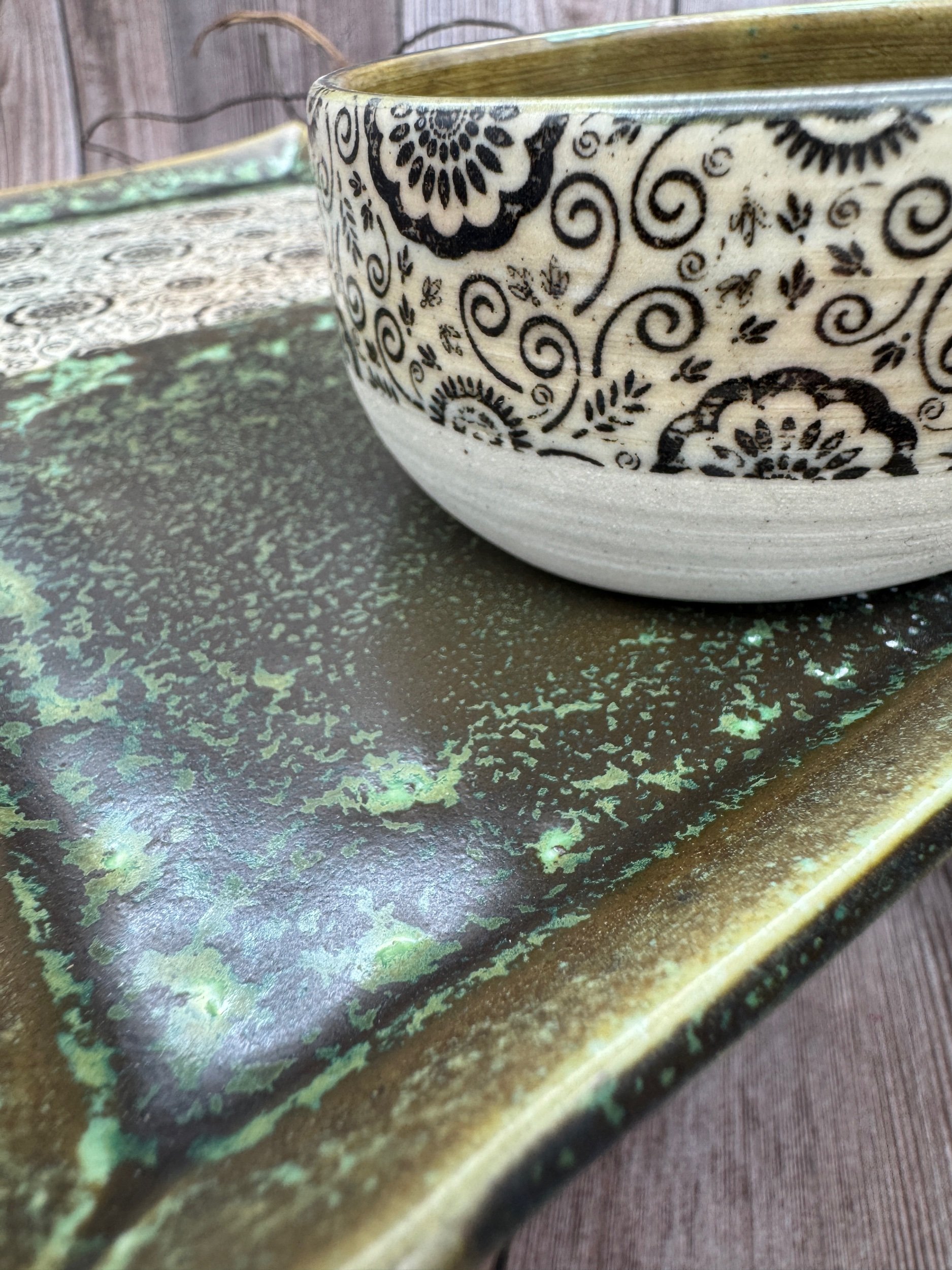Store › Green and Black Flower Tray Set Green and Black Flower Tray Set $45.00 This handmade set is a very earthy set. Measuring 10x 5.5 and a dipping bowl. This handmade set is a very earthy set. Measuring 10x 5.5 and a dipping bowl. Add To Cart Added!