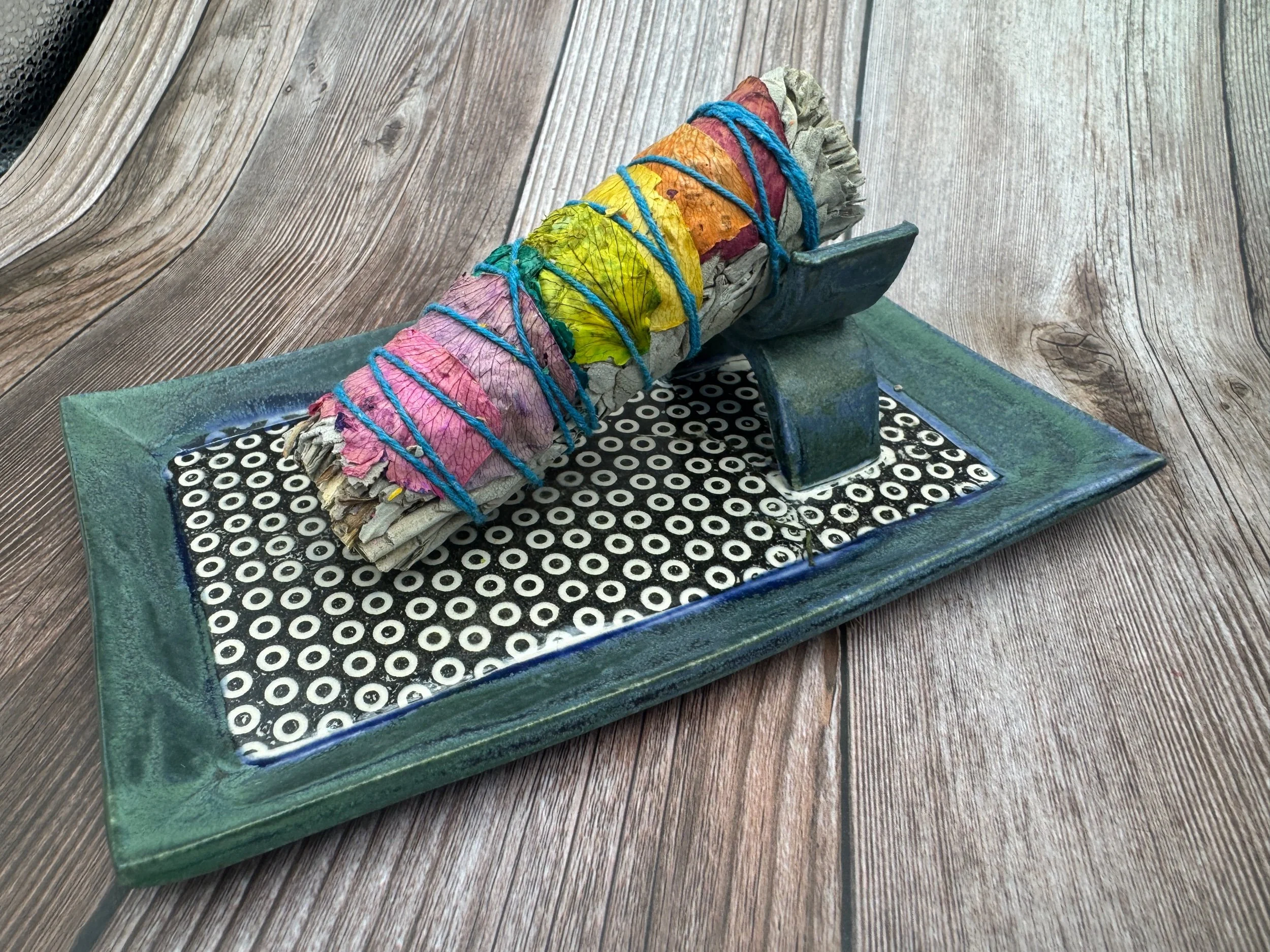 Store › Burner Tray : sage or cigar Burner Tray : sage or cigar $25.00 This gorgeous pattern with the blue/green glaze is very fitting for both a cigar tray or a sage burner. This gorgeous pattern with the blue/green glaze is very fitting for both a cigar tray or a sage burner. Add To Cart Added!