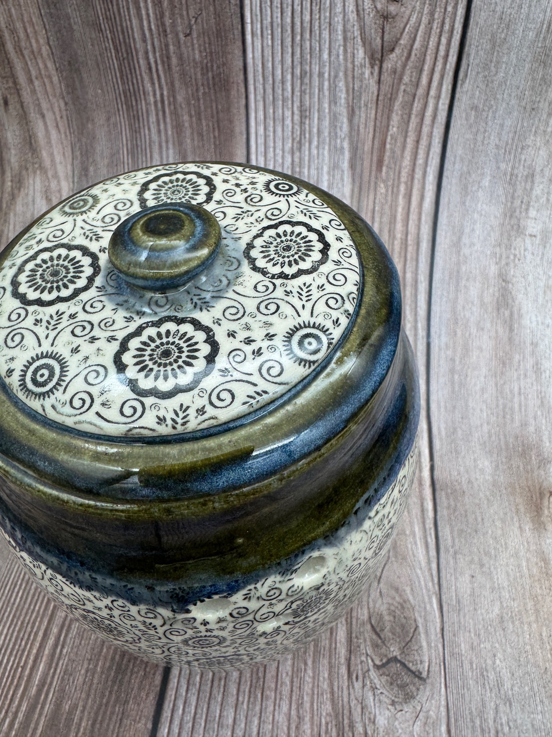 Store › Deep Blue Green Garlic Container Deep Blue Green Garlic Container $50.00 This garlic container has a black floral design with a deep blue and green glaze. This garlic container has a black floral design with a deep blue and green glaze. Add To Cart Added!