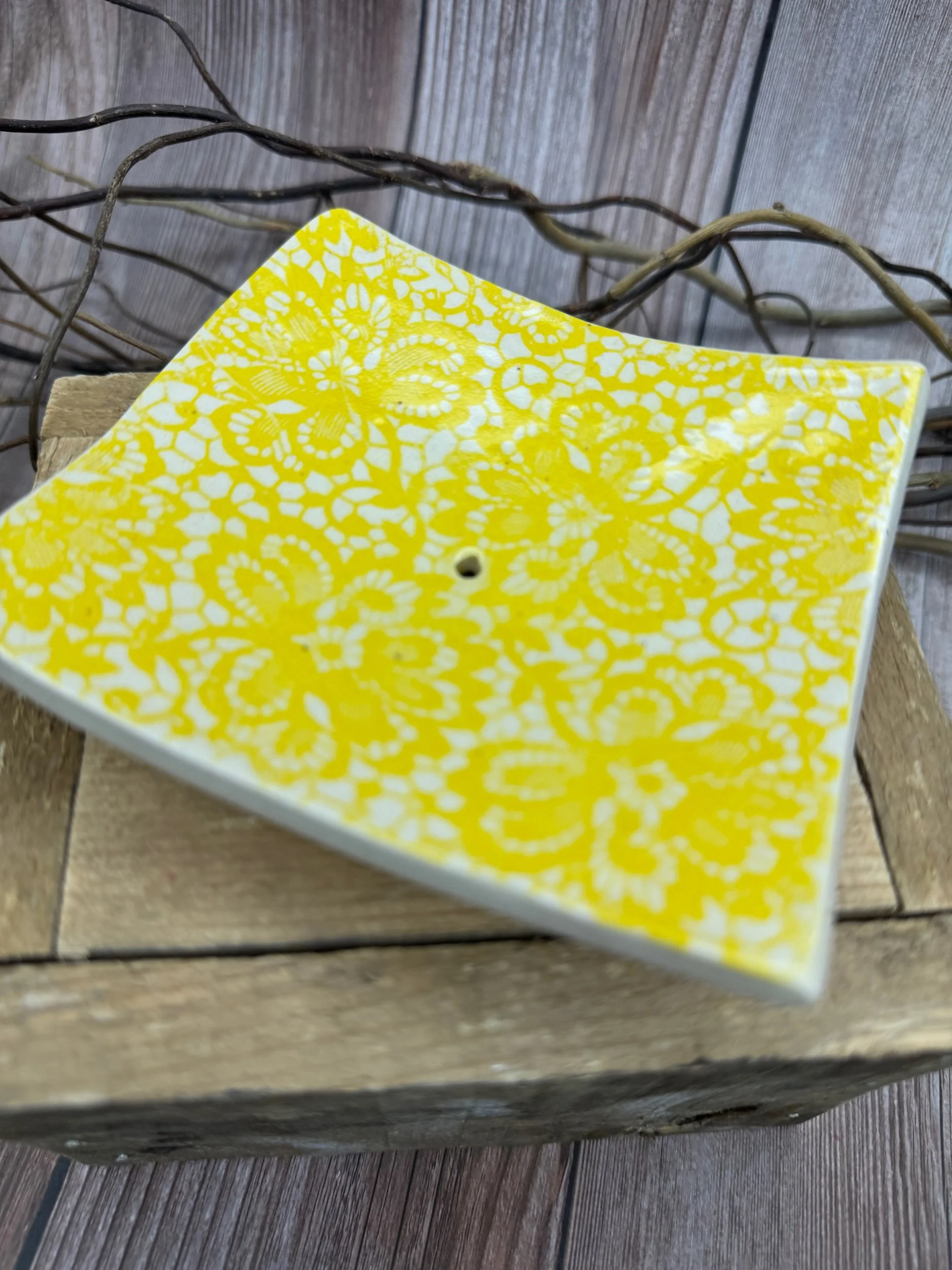 Store › Yellow Lace Soap Dish Yellow Lace Soap Dish $18.00 Sweet soap dish with a hole in the center to drain water. Sweet soap dish with a hole in the center to drain water. Add To Cart Added!