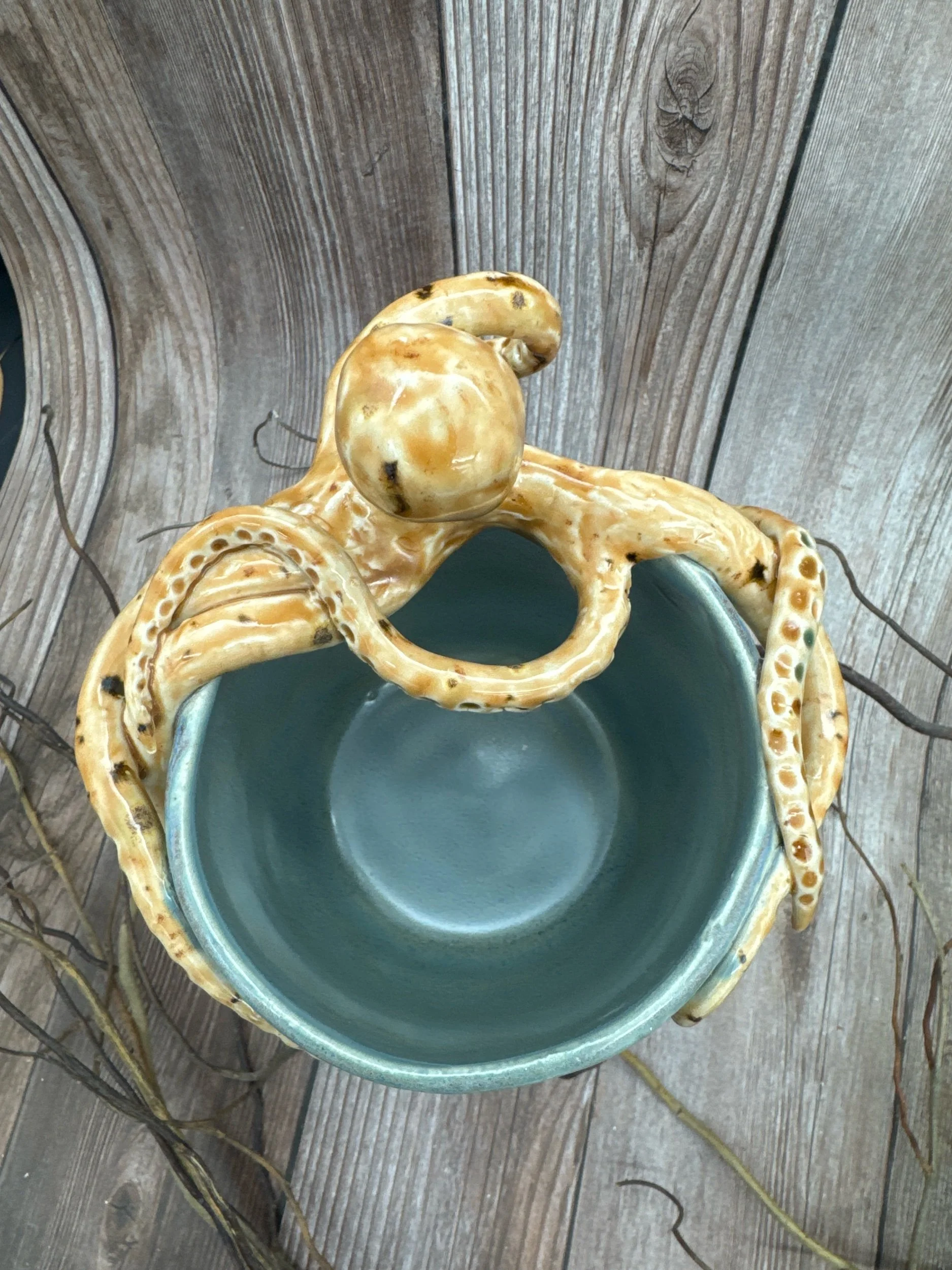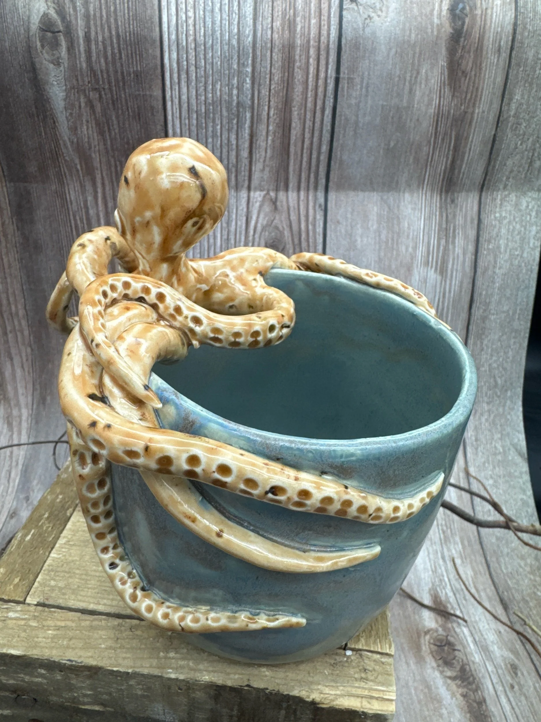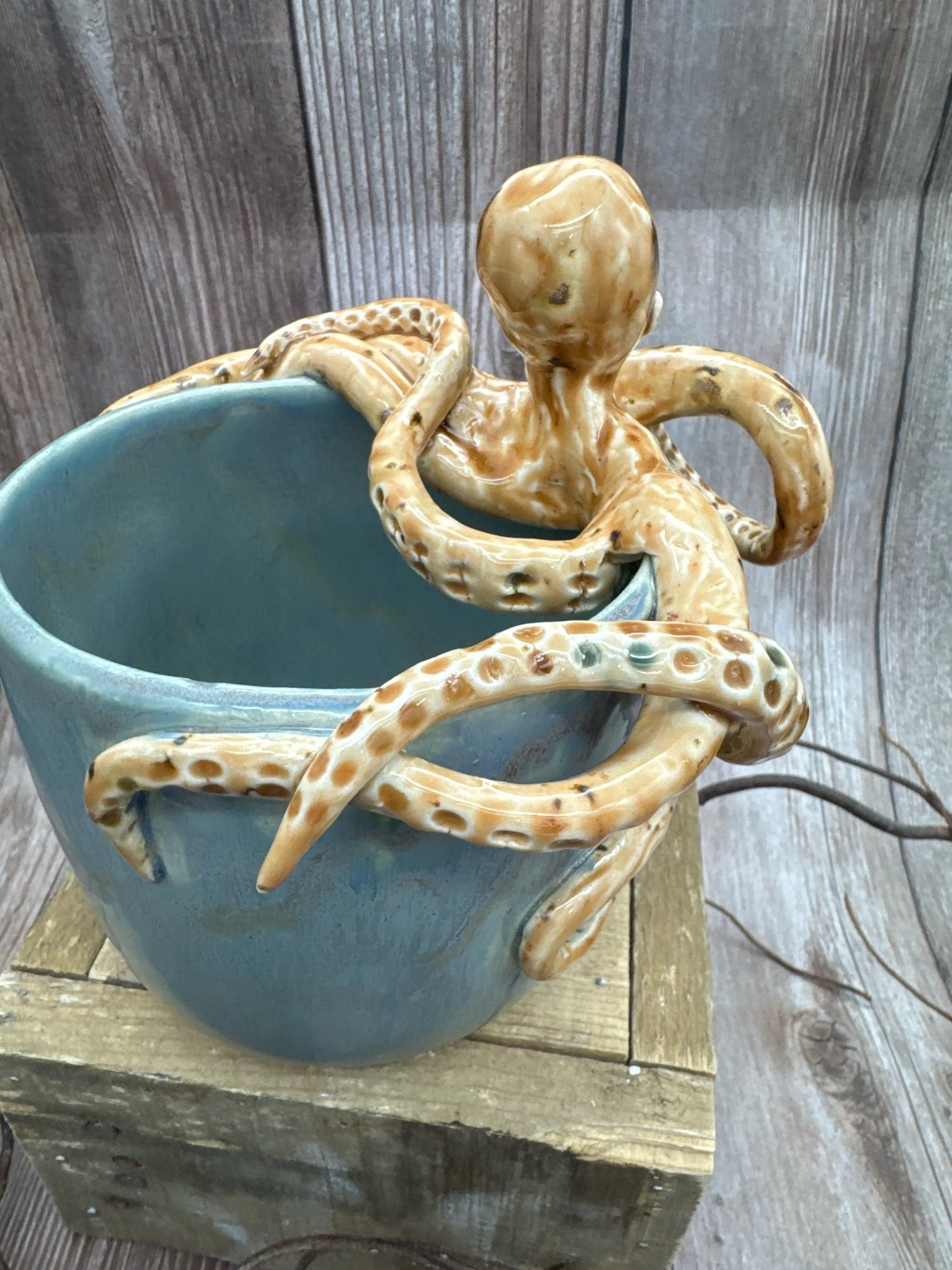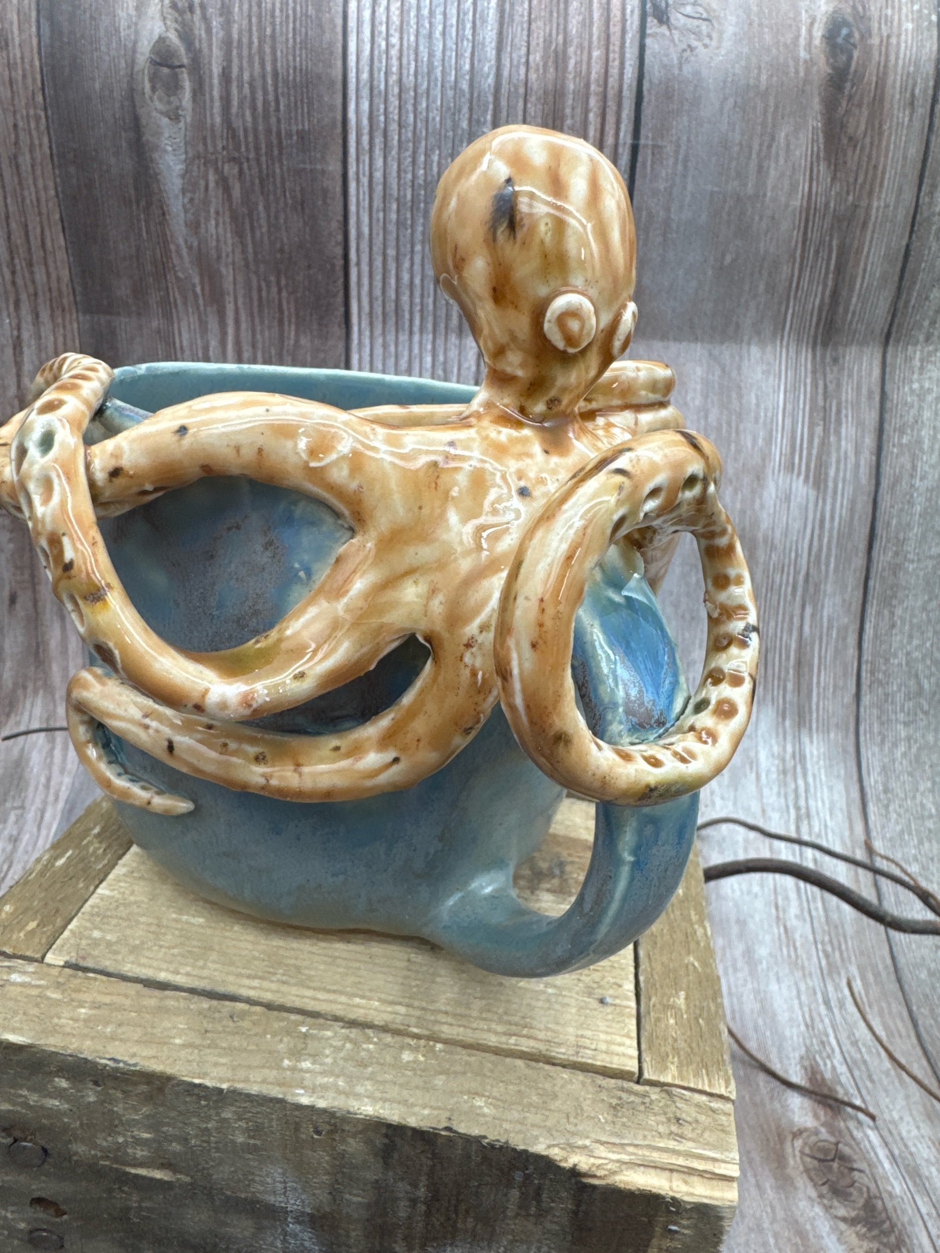 This beautiful wheel thrown mug adorned with an orange gorgeous octopus along the sides, even having a thumb spot between the arms!!