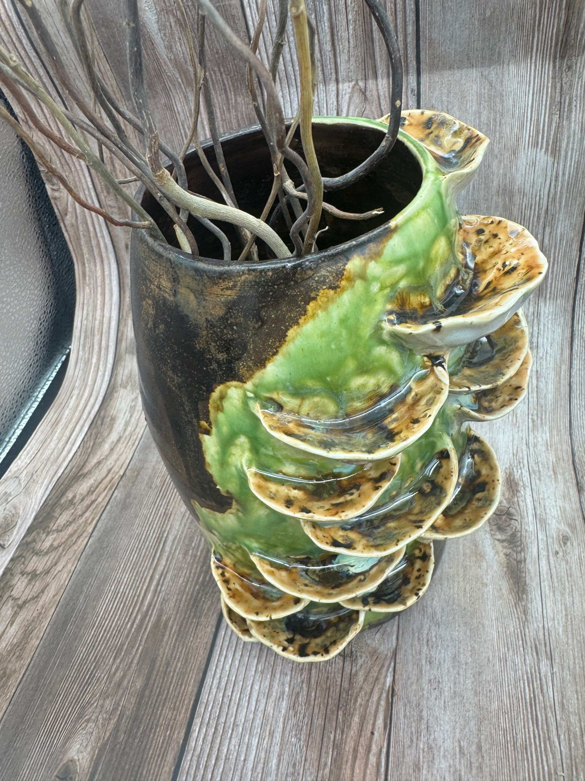 This wheel thrown and hand built mushrooms is beautiful and about 9in tall and 6 in wide.